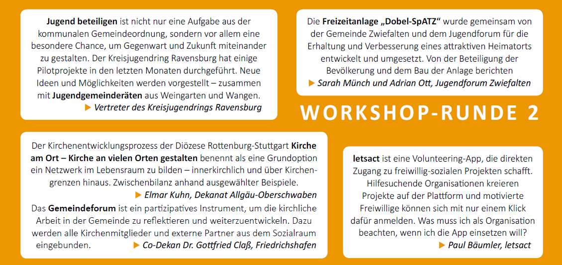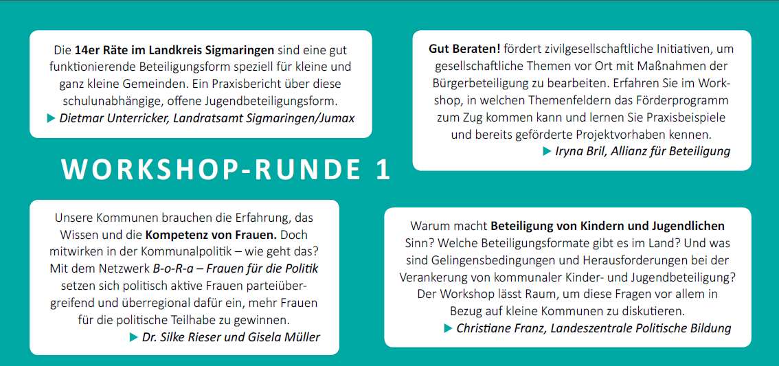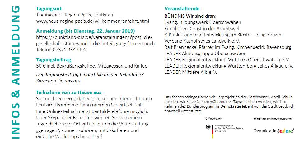 Demokratische Strukturen müssen auf gesellschaftliche Veränderungen reagieren. In drei Diskussionsrunden arbeiten wir heraus, welche Veränderungen bei Jugendlichen, in der Wirtschaft und im Ehrenamt gerade passieren. Vertreter/innen von etablierten und innovativen Modellen der Mitgestaltung werden uns vorstellen, wie sie darauf reagieren. Prof. Paul-Stephan Roß hilft uns mit Erkenntnissen aus der Beteiligungsforschung, die Umbrüche besser zu verstehen. Die Perspektiven Jugendlicher auf Beteiligung in Kommunen, im Arbeitsleben und im Ehrenamt erfahren wir in kurzen Theaterszenen. Zwei Leutkircher Schulklassen werden sich dafür in einem viertägigen Projekt mit Demokratie und Beteiligung auseinandersetzen. Nachmittags setzen wir uns mit gelungenen Beispielen für Beteiligung und Mitgestaltung auseinander und erhalten Tipps zur Nachahmung.