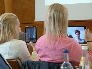 Hier ein Bild aus einer bereits durchgeführten virtuellen Tagung zum Thema Mobilität bei dem man zwei virtuell teilnehmende auf dem i-Pad mit ihren real teilnehmenden Partnerpersonen sieht.