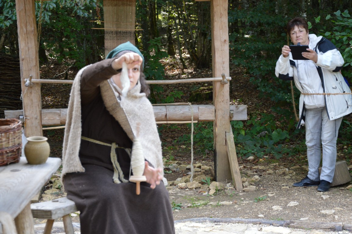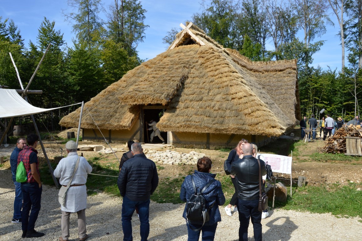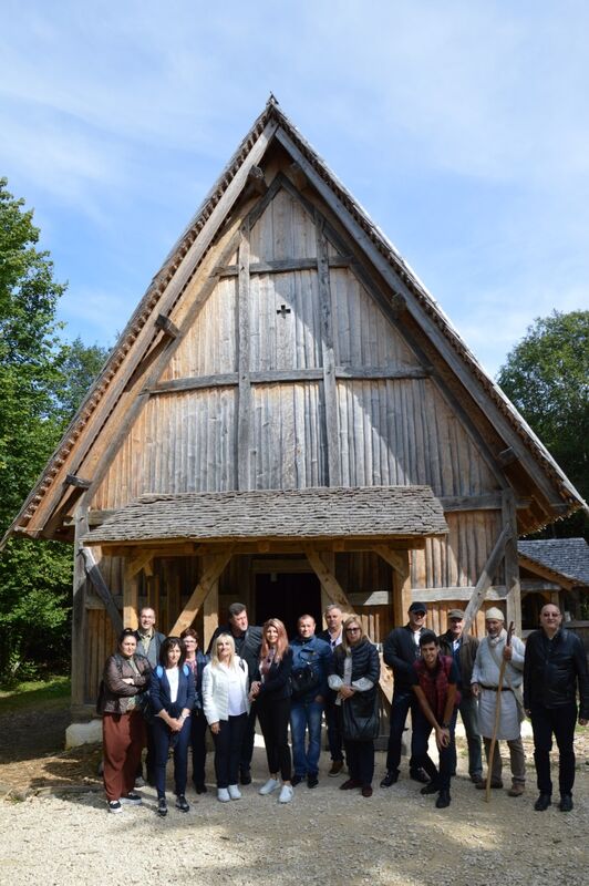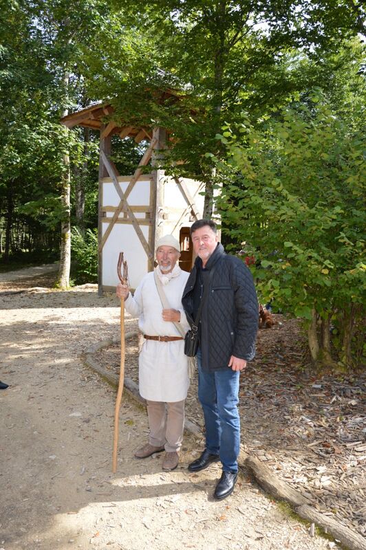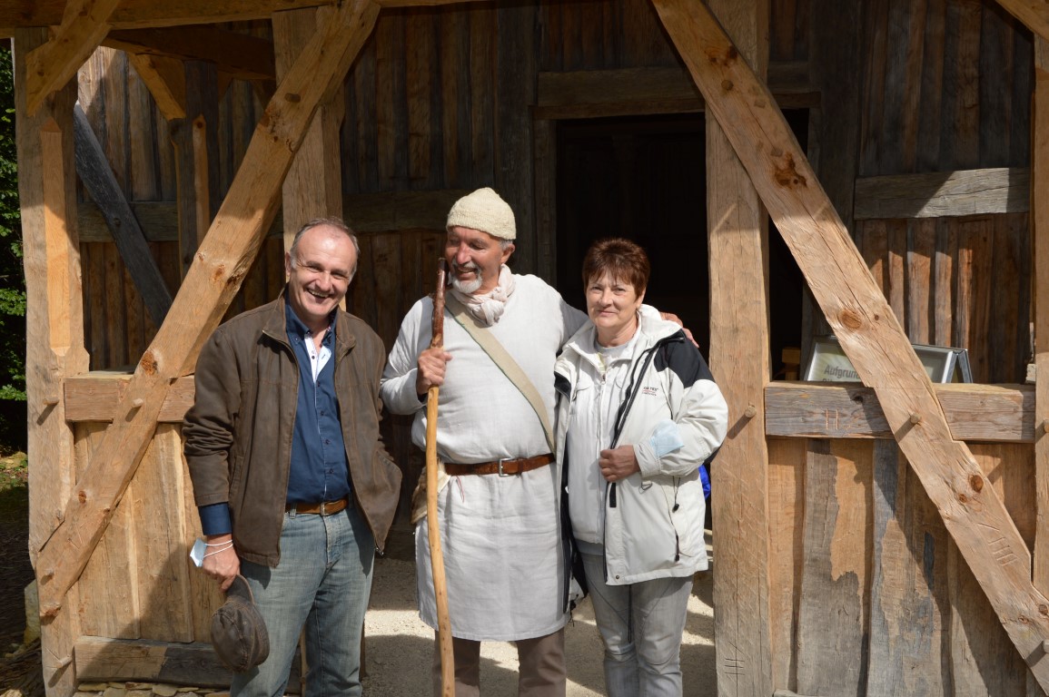 Am Tor des Campus Galli erwartete uns der Ehrenvorsitzende Heinrich Güntner im Häs des frühen Mittelalters, gemeinsam mit Bürgermeister Arne Zwick. Beide berichteten über die Anfänge der mittelalterlichen Klosterbaustelle, die Rolle der LEADER-Fördermöglichkeiten und die steigenden positiven touristischen Auswirkungen des Großprojektes für die Region. Heinrich Güntner führte anschließend die Gruppe über den Campus und reiste mit ihnen in die Zeit des 9. Jahrhunderts. Sehr beeindruckend war das jüngste mit LEADER-Mitteln geförderte Projekt, die Errichtung der großen Scheune.