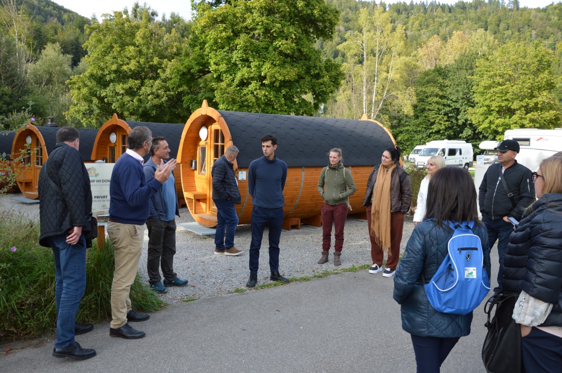 Nach der Zeitreise in das frühe Mittelalter ging es weiter nach Beuron, zur Besichtigung des "Camp im Donautal" mit den gemütlichen Schlaffässern. Projektträger Jürgen Burchardt und Bürgermeister Raphael Orsmakowski-Miller informierten die Gäste über den zunehmenden Tourismus im Donautal und die Idee der Schlaffässer als attraktive und besondere Übernachtungsmöglichkeit.