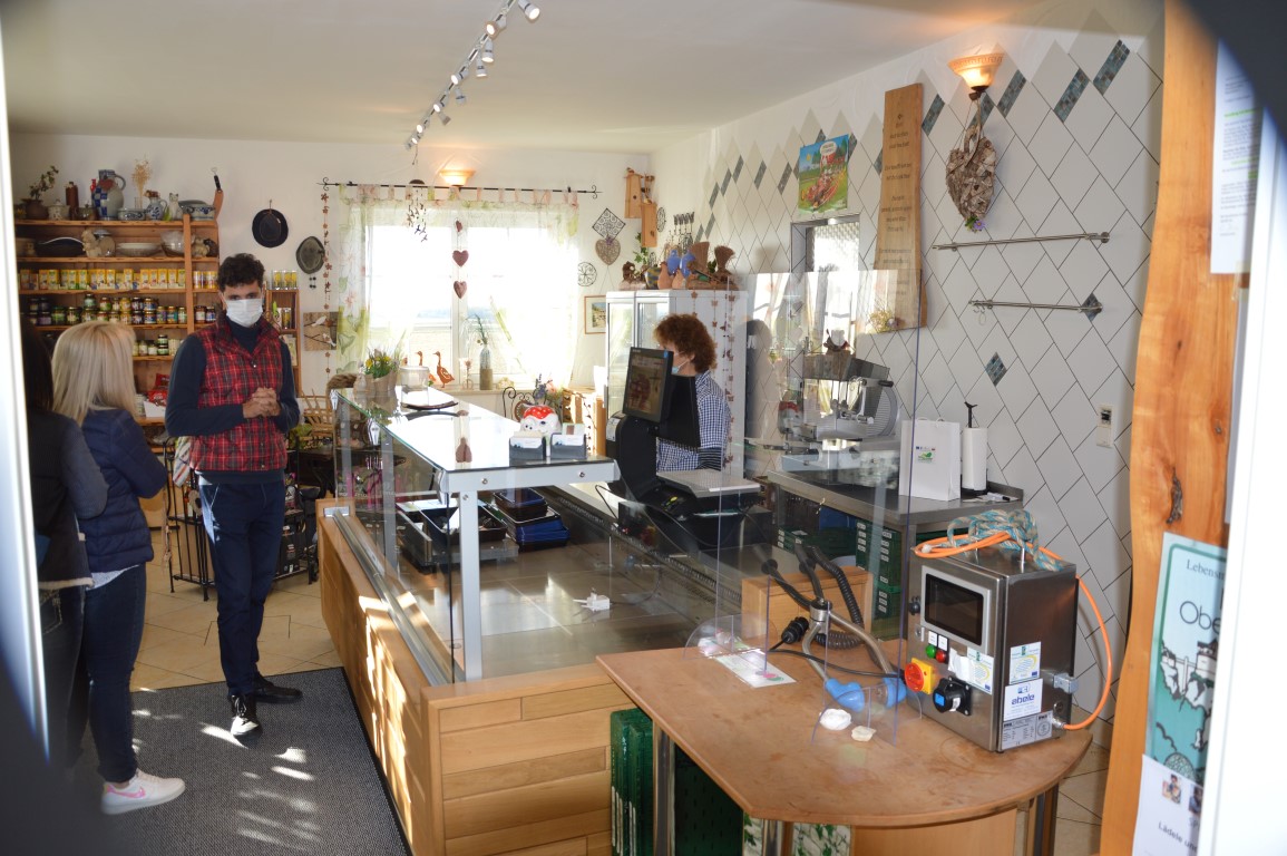 Auch am nächsten Morgen wird wieder bei strahlendem Sonnenschein mit Frauen-Power gestartet. Christine Keller vom Bäumlehof in Leibertingen zeigte unseren Gästen ihr Lädele und berichtet über die unterstützenden LEADER-Fördermöglichkeiten. So wurde die Inneneinrichtung ihres Bioland-Hofladens vor einigen Jahren gefördert und um eine Kleinprojektförderung konnte sie sich im Jahr 2019 auch erfolgreich bewerben.