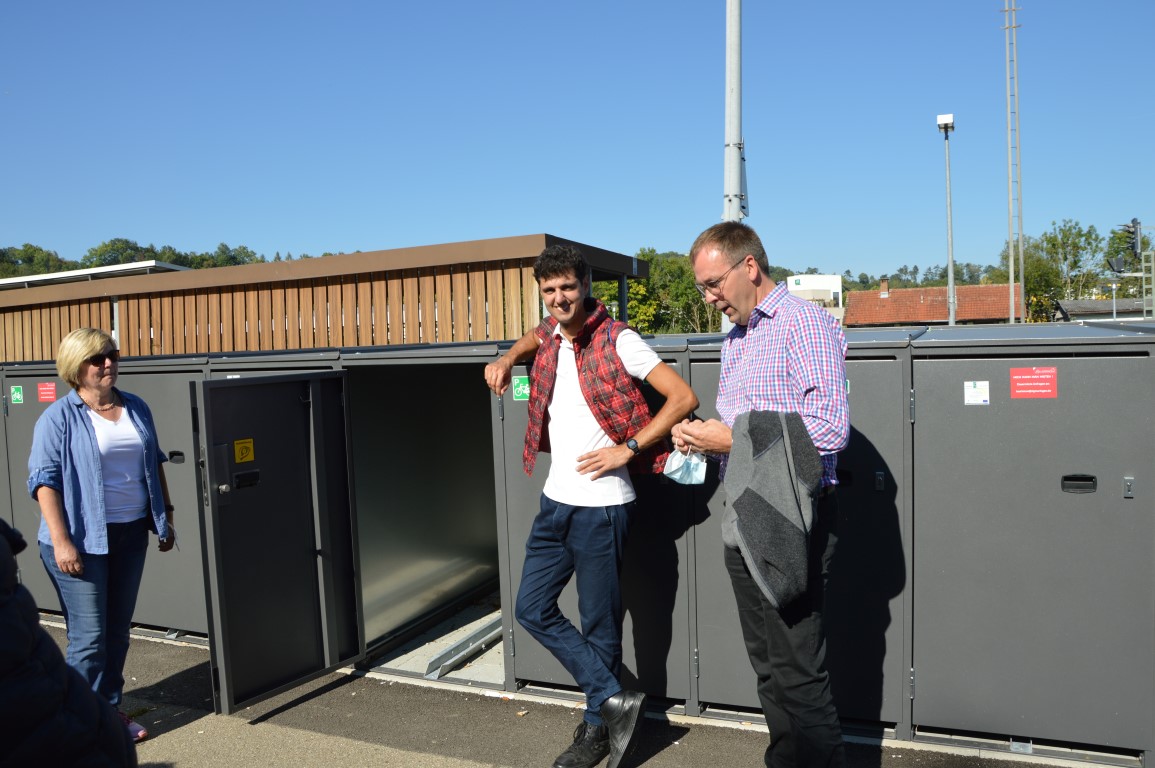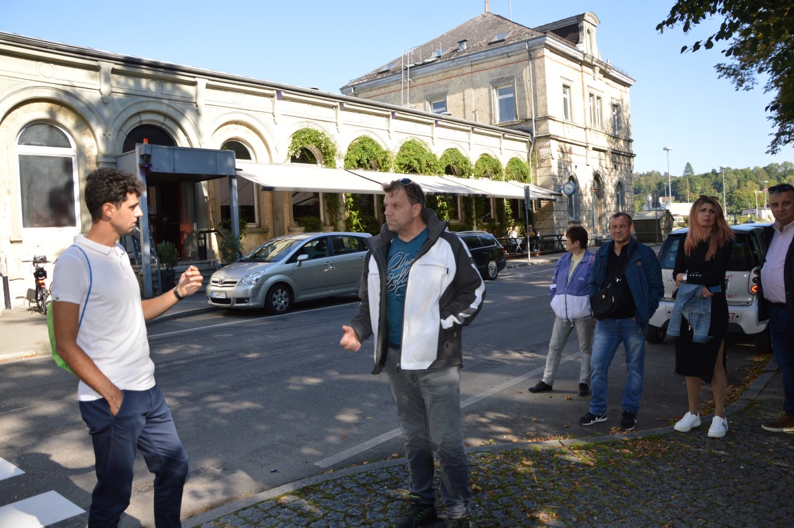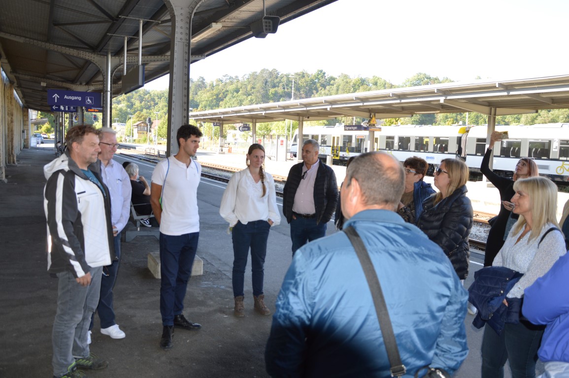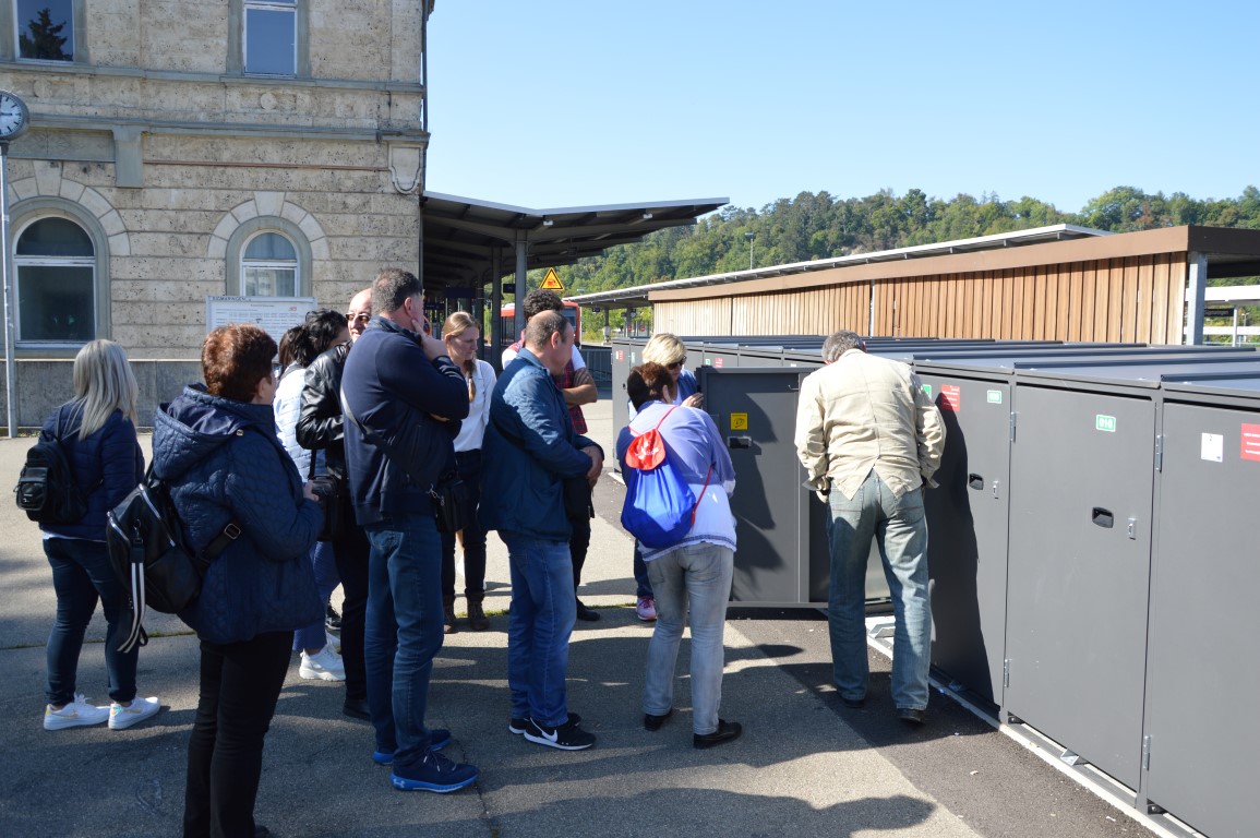 Dort haben wir die Fahrradboxen, einem Kleinprojekt, besichtigt. Frau Sieber von der Stadt Sigmaringen informierte die Gäste über den Fokus auf alternative Mobilität und die Verbindung zwischen Fahrradfahren und Bahnreisen. Die Boxen werden rege genutzt und dankbar angenommen, um die zum Teil hochwertigen Räder, aber auch Radtaschen etc. sicher zu verwahren. Zum historischen Bahnhofsgebäude informierte Andreas Marquardt, dass er dieses als privater Investor mit LEADER-Mitteln aus dem Dornröschenschlaf wecken werde und das kulturelle Erbe erhalten möchte. Im Ostturm richtet er ein Mikrohotel ein, welches im besonderen historischen Flair, aber mit modernsten Errungenschaften zum Übernachten und Wohlfühlen einladen soll.