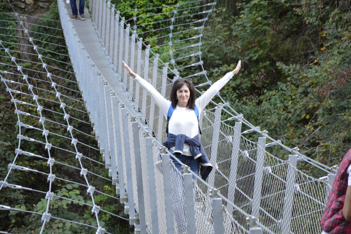 Weiter ging es zu historischen Pfaden nach Inzigkofen. Dort wurden unsere Gäste von Bürgermeister Gombold erwartet und über den Fürstlichen Park mit der Eremitage der Fürstin Amalie Zephyrine informiert. Das Highlight war die Erlebnisbrücke, ebenfalls mit Unterstützung der LEADER-Aktionsgruppe ermöglicht. Die Brücke sei ein Magnet, viele Touristinnen und Touristen kämen, aber auch Besucher*innen aus Inzigkofen und der Umgebung suchten regelmäßig die Brücke, die sich wie ein Spinnennetz oberhalb der Donau wiegt, auf.