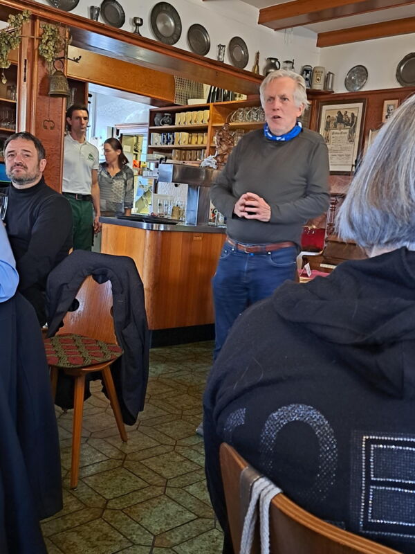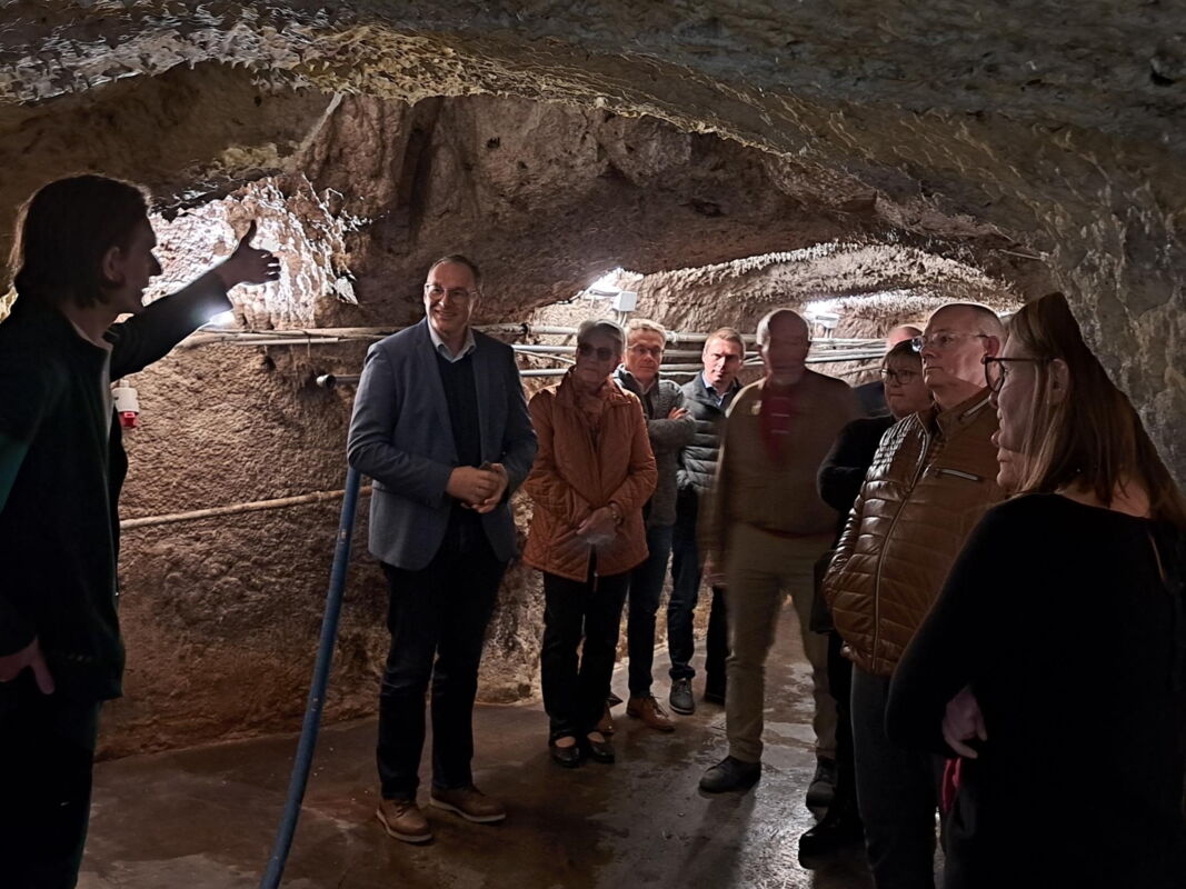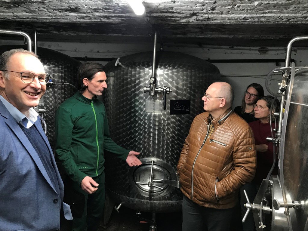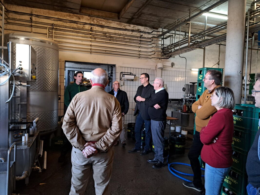 Nach dem offiziellen Teil der Mitgliederversammlung führte Thomas Blank durch "seinen Betrieb" und zeigte die verschiedenen Betriebszweige mit Gastronomie, Brauerei und Obst-Kelterei, ebenso wie den Tropfstein-Keller "unter der Straße" und die Tropfstein-Höhle. Schwer beeindruckt waren die Mitglieder nicht nur vom Traditionsbetrieb an sich, sondern auch von den präzise eingebauten Biertanks im Keller, der modernen Kühlung, der Abfüllanlage sowie der neuen Beleuchtung im Keller: herausfordernde Arbeitsbedingungen in historisch gewachsenem Keller-Gebäude!