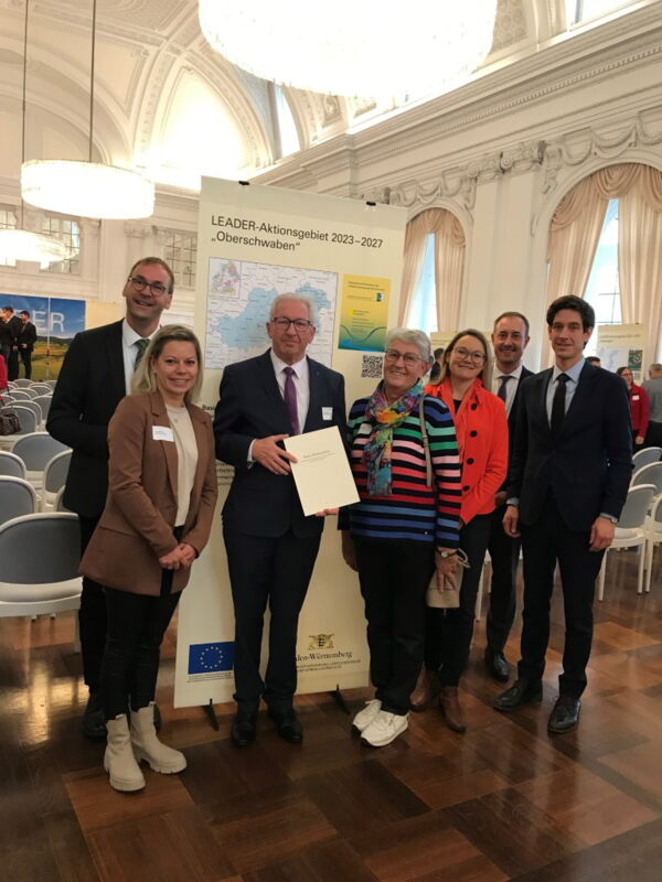 Foto: Die Vertretreter*innen aus dem LEADER-Gebiet Oberschwaben (s.o.) freuen sich über die Auswahl und die Darstellung:
