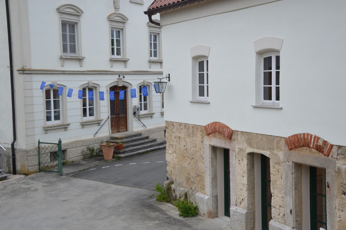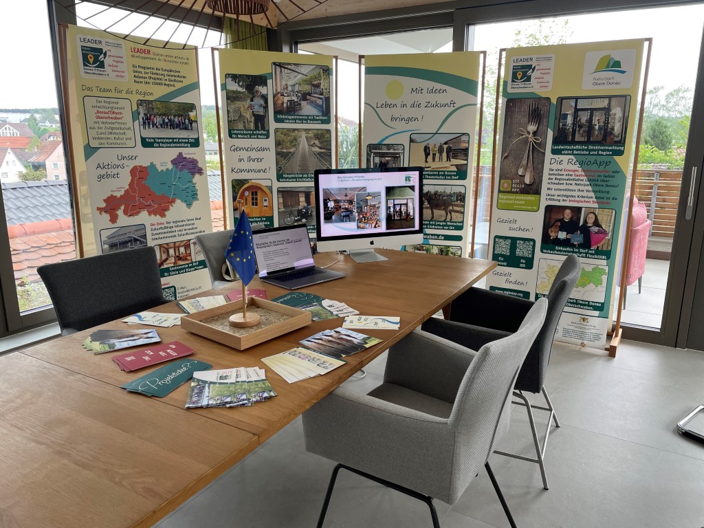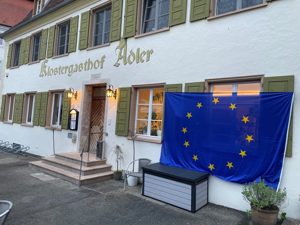 Am Fenster des traditionellen Klostergasthofs Adler bei Familie Schultz wehte eine große Europaflagge. Eine Wimpelkette mit vielen kleinen Europafähnchen flatterte schräg gegenüber zwischen Wohnhaus und dem Gästehaus My Resilia der Familie Köberle. Ein Aufsteller unserer LEADER-Aktionsgruppe Oberschwaben wies den Weg zur Veranstaltung.