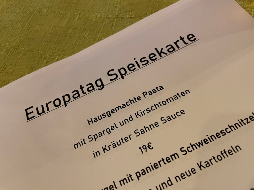 Krönender Abschluss des gut besuchten und sehr kurzweiligen Europatages war das gemeinsame Abendessen im Klostergasthof Adler. Besonders eindrücklich in dem historischen Gebäude, das dank der Wirtsfamilie Schultz und nicht zuletzt einer LEADER-Förderung vor einigen Jahren wiederbelebt werden konnte, war die 300 Jahre alte Holzdecke in der Gaststube. Familie Schultz hatte sogar eigens für den Europatag eine Speisekarte zusammengestellt – wie gewohnt regional und saisonal, was an diesem Abend hieß: Spargel in mehreren leckeren Variationen.