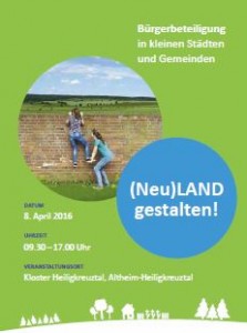 Am Freitag, 08. April 2016 findet im Kloster Heiligkreuztal der Fachtag "(Neu)Land gestalten! Bürgerbeteiligung in kleinen Städten und Gemeinden" statt. Hierzu möchten die Initiative Allianz für Beteiligung e.V. Stuttgart und die LEADER Aktionsgruppe als Kooperationspartner Sie recht herzlich einladen!