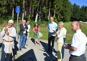 Eine persönliche Führung in mittelalterlicher Tracht gab Heinrich Güntner, Vorsitzender der LEADER Aktionsgruppe. Herr Napierala, Geschäftsführer des Vereins Karolingische Klosterstadt, erläutert den Bauplan der Klosterstadt und informiert, der Plan sei nicht als maßstabsgetreue Vorgabe zu verstehen, sondern vielmehr als Darstellung der Gebäude und Inhalte, die in der Klosterstadt nicht fehlen sollten. Die Errichtung, Aufteilung und Größe der Gebäude hinge vom Geländerelief und den natürlichen Möglichkeiten ab.