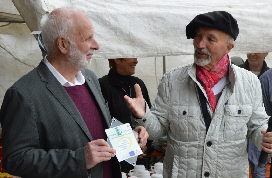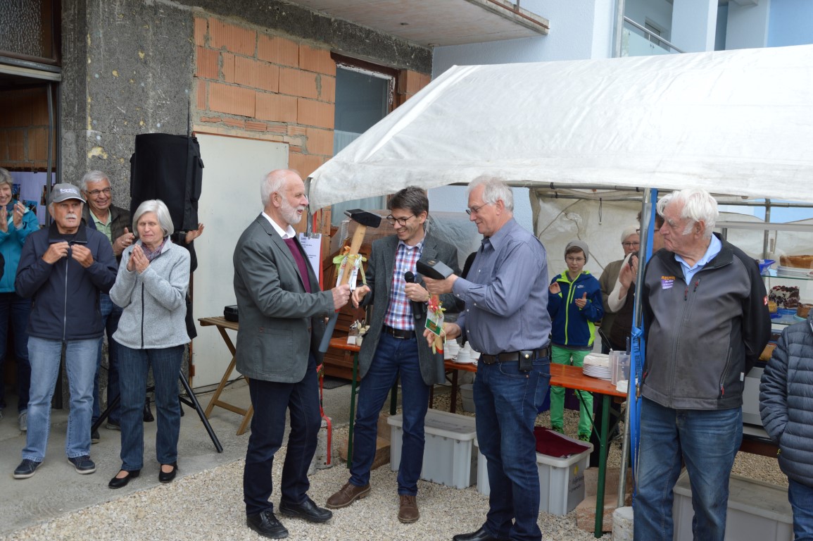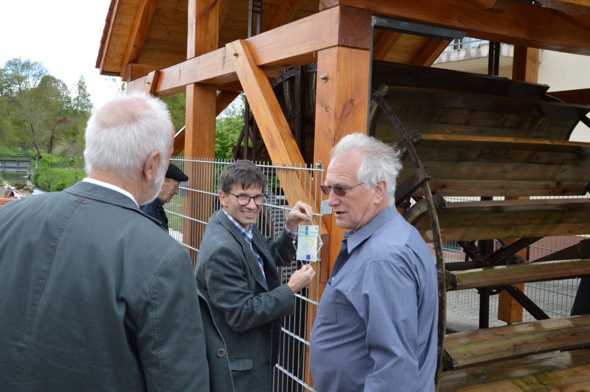 Heinrich Güntner stellte in seiner Ansprache die vielen notwendigen Zutaten in den Mittelpunkt und resümierte, dass auch Europa drin stecke, das über die LEADER-Förderung hier vor Ort das Engagement der Bürgerinnen und Bürger unterstützt. Zum Gesamtgelingen benötigt es jedoch Vieles, wie zuallererst Achtsamkeit sowie dann Erfindergeist, Geduld, findige und mutige Köpfe, Personen die anpacken und mithelfen und nun die Bürgerschaft, die gemeinsam ein Fest feiert und das Projekt so stützt und weiter trägt. Als Dank und Anerkennung überreichte er die LEADER-Förderplakette, auch hier mit Wink zum Gemeinsamen: an wen solle er die Plakette überreichen, da so viele aktiv beigetragen haben? Letztlich erhielt sie der Vereinsvorsitzende Tillo Brükner, der sie dann an Horst Arndt zur Anbringung weitergab - und Bürgermeister Jochen Fetzer überlegte mit: an welche Stelle wird sie angebracht?