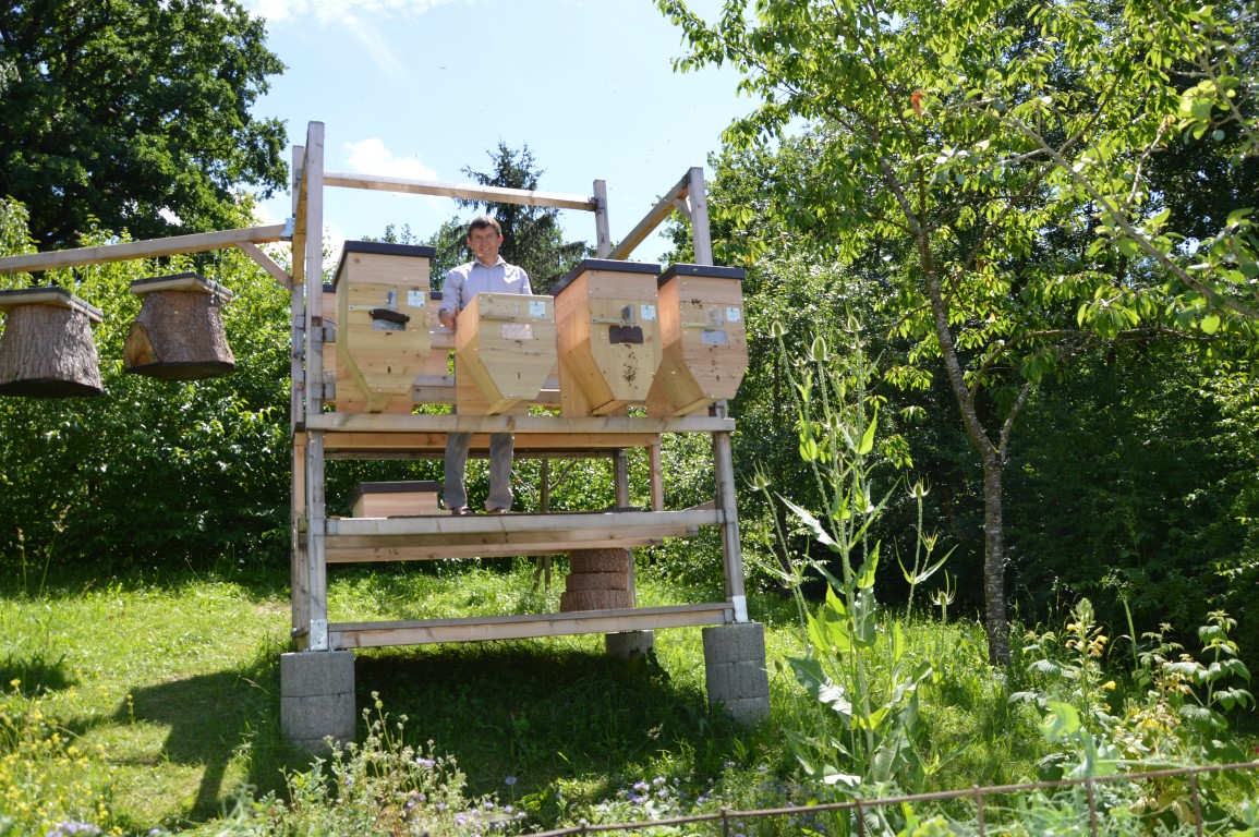 Stefan Sigel beschäftigt sich seit Jahren mit Bienen und hat diese neue Art entwickelt und patentieren lassen. In Zukunft soll der Bienenhochstand mit seinen innovativen Bienenbeuten Teil einer lebendigen Ausstellung "Imker*innen der Zukunft" sein und beinhaltet neben dem Hochstand auch eine veränderte Bienenbehausung und spannt den Bogen zwischen der herkömmlichen Imkerei und dem Naturwabenbau, bzw. der wesensgerechten Bienenhaltung. Das Ziel dabei: Verknüpfung von Urkraft, Tradition und Technik. Zielgruppen sind dabei alle Imker, sowohl Hobby- als auch Berufsimker.