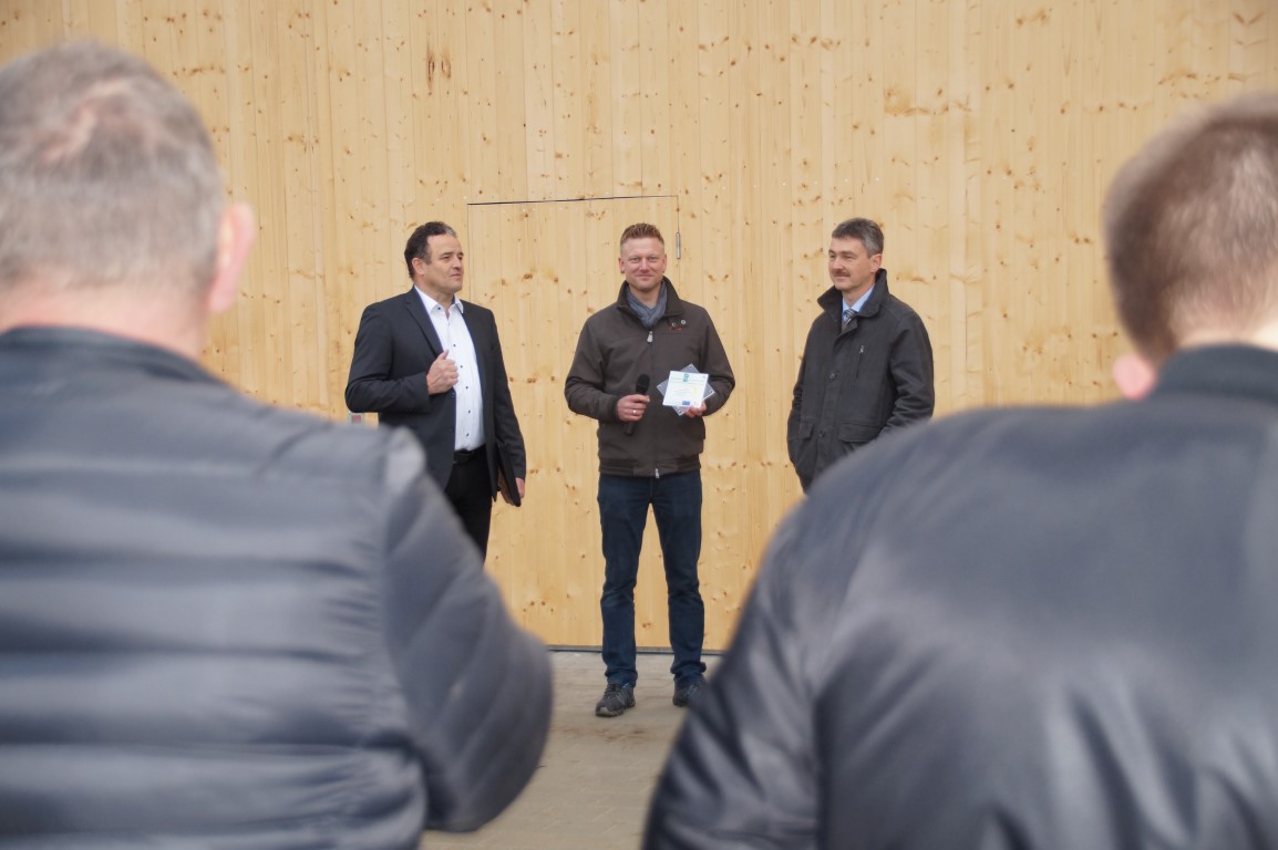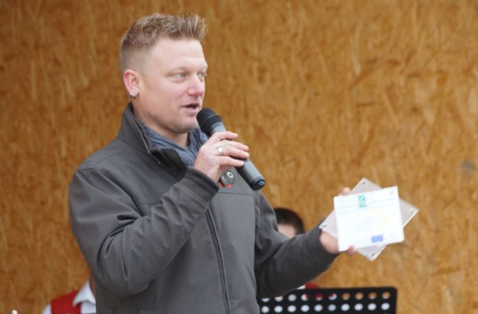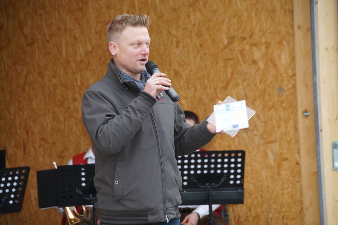 „Dieses stattliche Bauwerk hätte ich auch gerne in meiner Gemeinde“, so der Wunsch von Bürgermeister Bernhard Rizler aus Untermarchtal. Er war als Vertreter der Leader-Aktionsgruppe nach Hohentengen gekommen, um der Übergabe des Vereinsschuppens beizuwohnen. Bei der Förderung von Objekten durch Leader gehe es nach seinen Worten auch darum, den Zusammenhalt in der Gemeinde zu fördern, was vor allem durch die Vereine geschehe, daher habe man einen Zuschuss von 68 000 Euro gerne gewährt. „Sie haben was Tolles gemacht, das Bauwerk ist gelungen, was aber nur möglich war, weil Leute da waren, die was geschafft haben“, so seine Anerkennung. Er übergab im Anschluss die Leader-Plakette an Stefan Rothmund mit der Bitte, sie sichtbar am Vereinsschuppen anzubringen, „damit Leader zu sehen ist und wahrgenommen wird“, so Bernhard Ritzler.