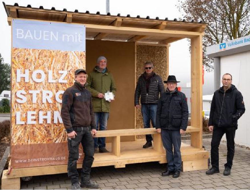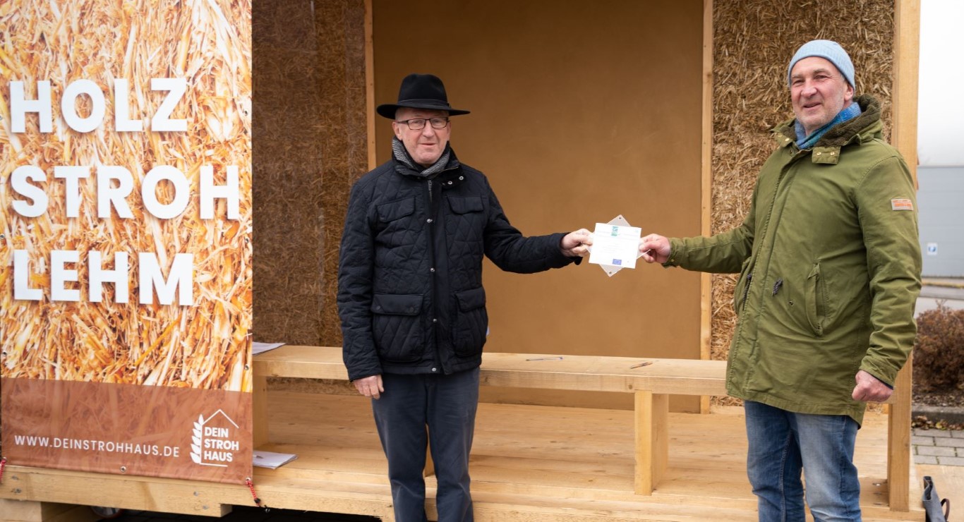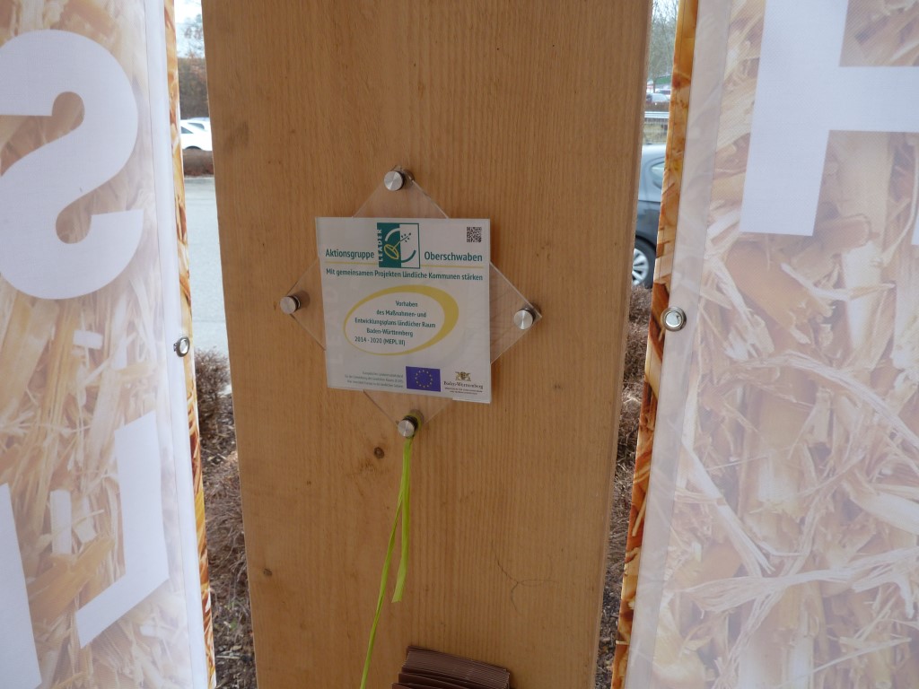 Ziel des über ein LEADER-Kleinprojekt geförderten Infopavillon "Bauen mit Stroh" ist die Information und die Aufklärung über eine alte Bauform, die mit mit aktueller Handwerkskunst nicht zuletzt als Beitrag für einen aktiven Klimaschutz mit bedacht werden sollte. Im Rahmen der Vorstellung des Projektes überreichte Vorsitzender Alois Henne dem Projektträger Jochen Plass die LEADER-Plakette.