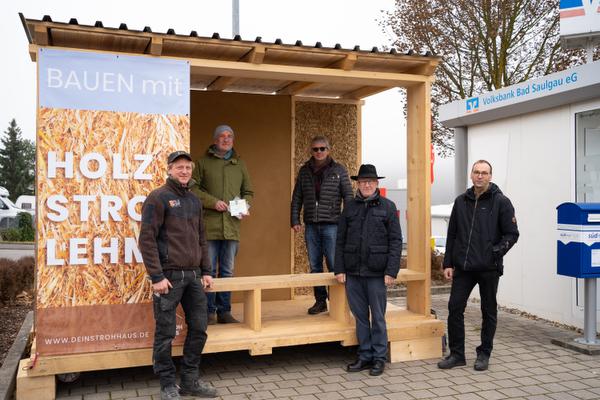 Foto (v.l.n.r.): Tobias Kopp von der Holz Kopp GmbH (sein Betrieb hat die Holzkonstruktion des Pavillons gemacht), Architekt Jochen Plass, Peter Henkel (sein Betrieb hat das Stroh gepresst), Alois Henne und Emmanuel Frank von LEADER. (Foto: Mandy Hornstein)
