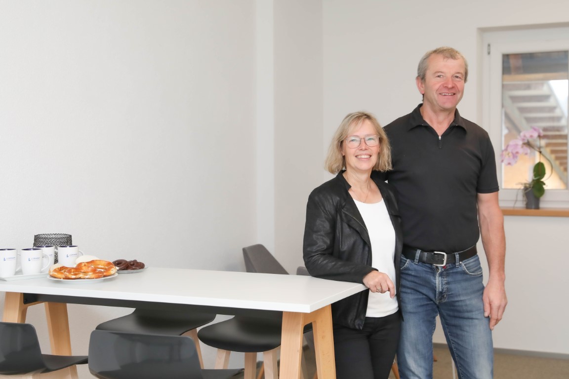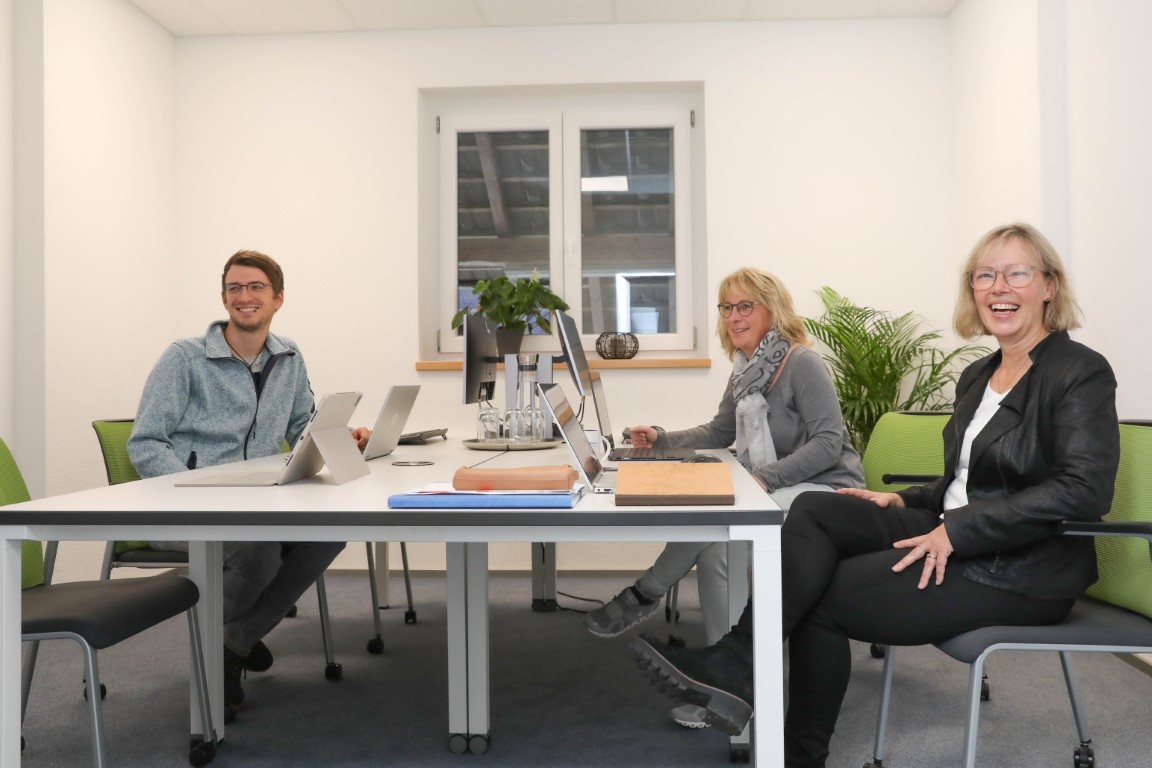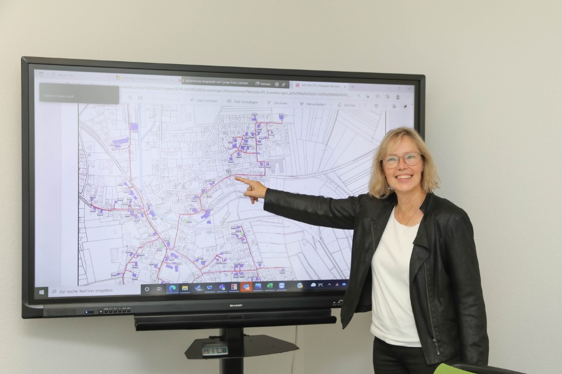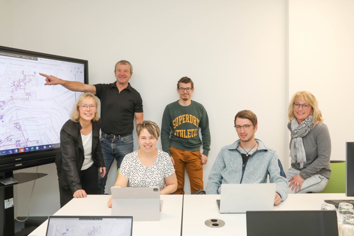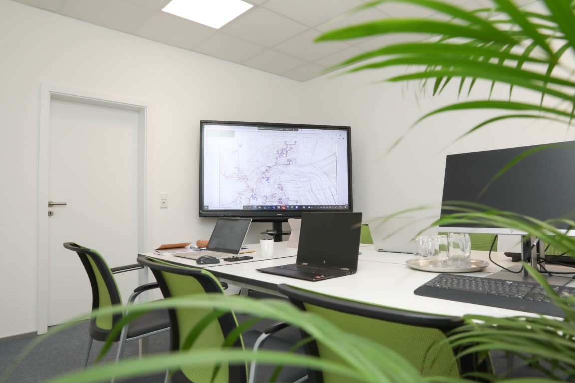 Frau Lorinser und ihr Team von 7 Mitarbeitern haben sich im Laufe der Zeit neben der Planung der Gebäudetechnik auf die Realisierung von Wärmenetzen spezialisiert. Die steigende Nachfrage nach Nahwärme bzw. Wärmenetzen und erneuerbaren Energien brachte immer wieder zum Vorschein, dass die technische Ausstattung und die passenden Räumlichkeiten fehlen um auch „online“ Besprechungen, Schulungen, Videokonferenzen oder Informationsaustausch mit Projektträgern möglich zu machen. Um zukünftig auch ohne weite Anfahrten fachkundige Beratungen geben zu können, wurde mit Hilfe der Förderung der LEADER-Aktionsgruppe Oberschwaben im oberen Stockwerk des Firmengebäudes ein Konferenz- bzw. Schulungsraum eingerichtet. Die Technik hier ist auf dem neuesten Stand. An jedem Sitzplatz ist ein Notebook oder PC vorhanden. Der riesige Monitor ist optimal zum Präsentieren großer Baupläne. Der zugehörige Vorraum wurde zum Aufenthaltsraum umfunktioniert. Hier kann in den Pausen Kaffee und Snacks serviert werden. Laut Frau Lorinser vergeht kaum ein Tag, an dem der Konferenzraum nicht genutzt wird. Wie sich zeigt haben sich die Investitionen voll und ganz gelohnt.